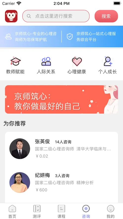 京师筑心是为学生打造的心理健康服务平台,由名校博士基于科研、运用前沿技术研发。以心养心,提供咨询、测评、专家问答等功能,有专业团队,构建起全面心理服务体系 。
