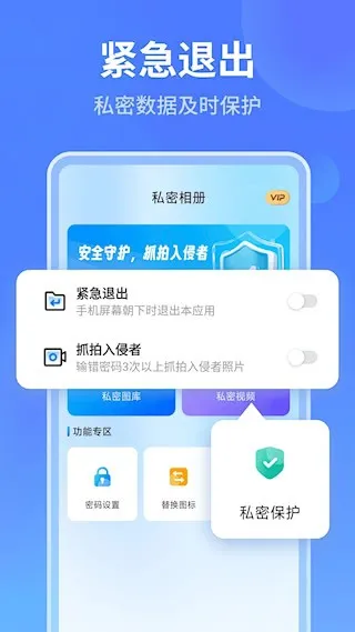 2、<秘密加密相册安卓版手机版>功能丰富多样,具备加密、存储、图标伪装、紧急退出、入侵抓拍等功能,满足多种需求。