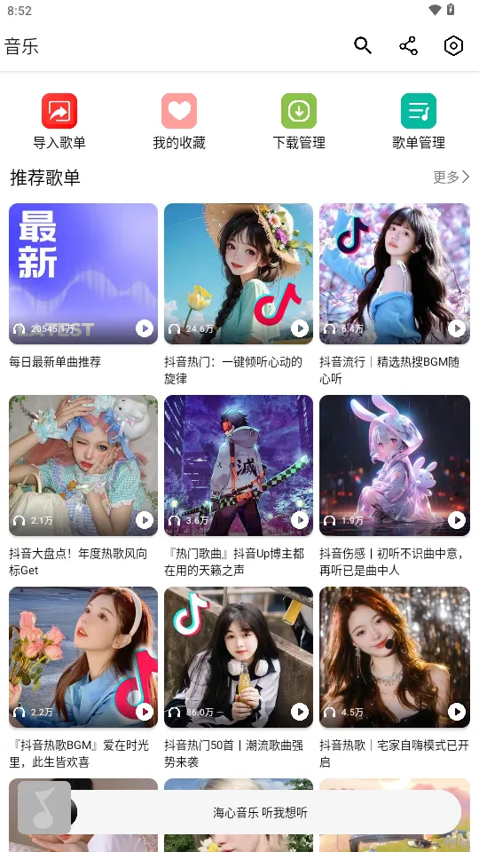 海心音乐是免费音乐平台,专为爱好者打造。界面简约,操作便捷,曲库海量多元,支持精准搜索与特色推荐。有高品质音质,能离线下载,还可创建分享歌单,满足多样音乐需求 。