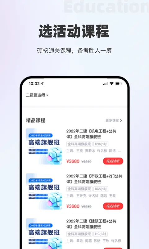 4、服务贴心,免费领课选课报名,还能掌握考试资讯动态;可与老师同学实时互动答疑,提高学习效果 。