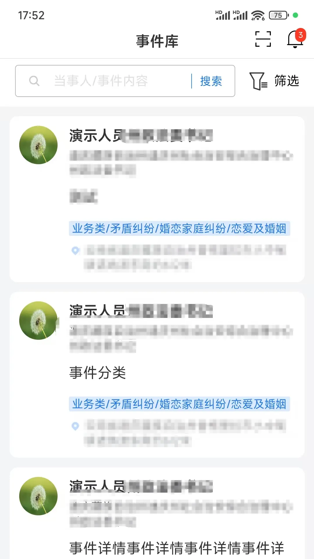 2、在矛盾纠纷处理方面表现出色,可高效上报事件,聚合在事件库统一管理,便于随时查询详情,有效促进社会治理。