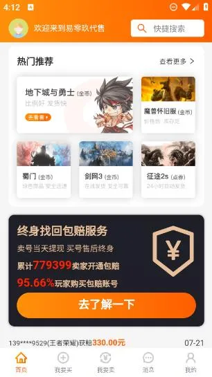 易零玖代售是专业游戏账号交易软件,采用银行级加密保障安全,有智能推荐与估值系统。覆盖多热门平台,交易流程简便,还有多种特色功能与法律保障,助玩家安全高效买卖账号 。