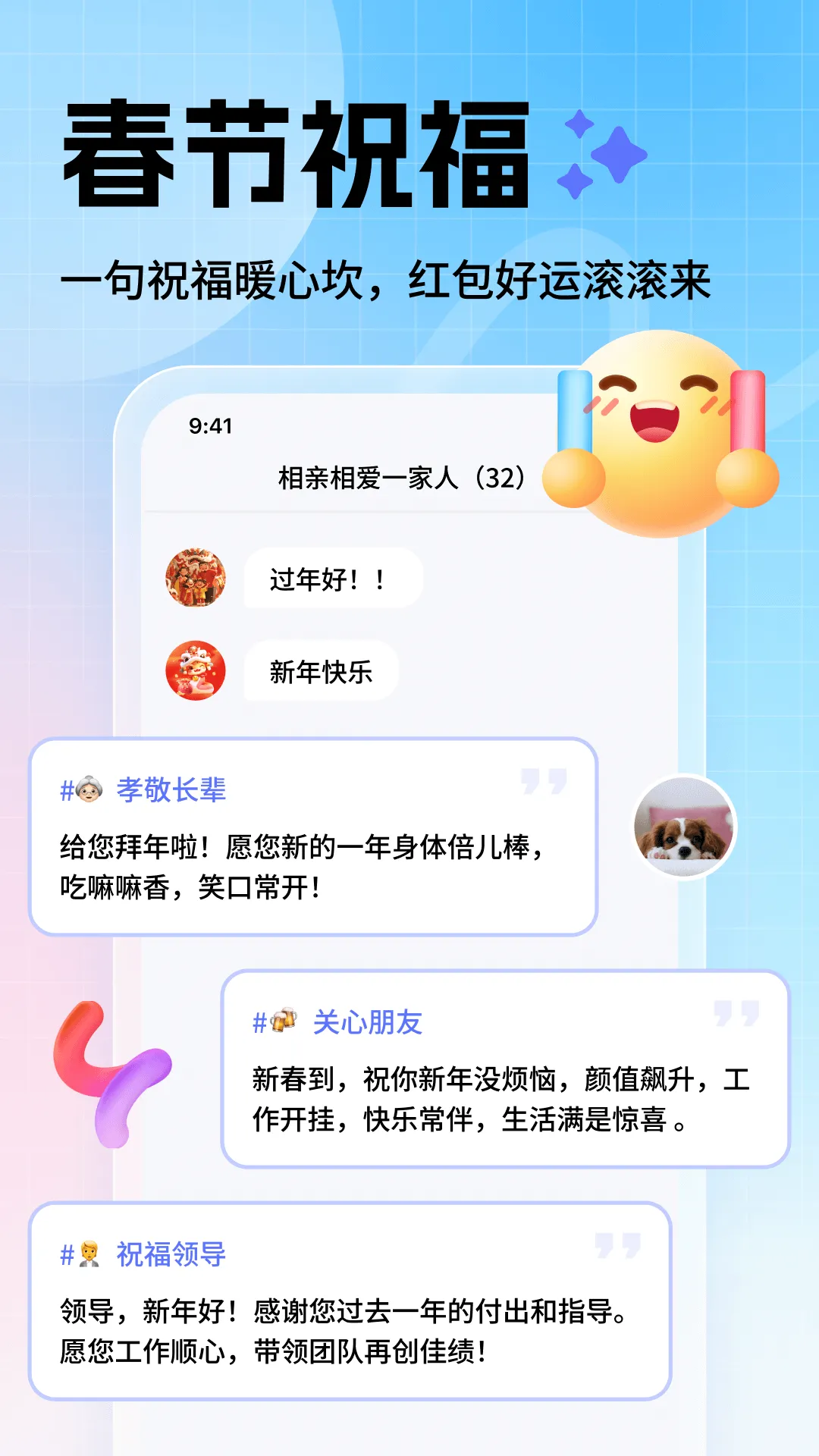2、场景赋能:内置丰富节日祝福模板,还有恋爱助攻、职场生存等多种模式,满足不同场景沟通需求,助用户在各场景沟通无忧。