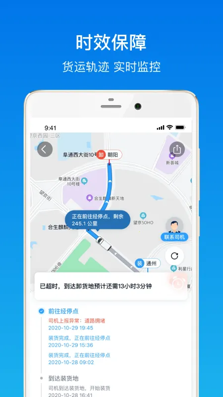 2、保障有力:业务网络覆盖全国,货物异常时福佑工作人员6小时内可到现场协助处理,司机严格备案,全程定位追踪。