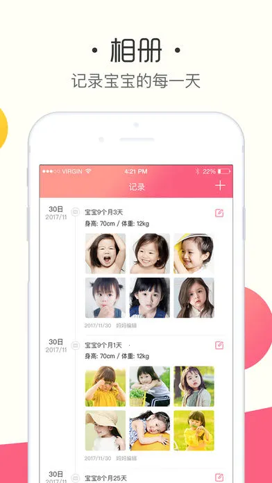 4、拥有多种记录孩子成长的方式,如成长相册、成长曲线,还有根据宝宝月龄变化的育婴指南。