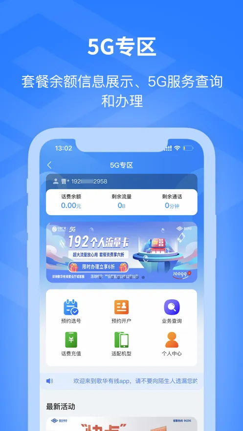 2、5G服务丰富:绑定5G手机号码后,在5G专区可展示话费和流量信息,还能进行预约选号、开户,查询账号相关信息、充值话费以及办理其他5G业务。