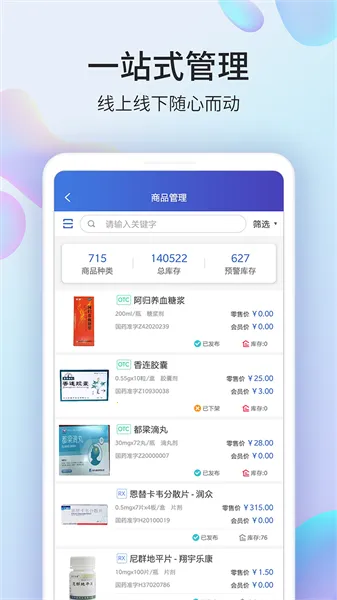 4、商家管理很高效:商家版软件整合智能采购、库存、物流等功能模块,能实时监控运营状况。有流量扶持,可连接全国消费者,还能对接互联网医院合法销售处方药,数据云备份安全稳定。