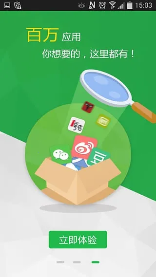 4、使用体验好:轻精简安装包,界面清新简约,节省手机存储,带来清爽快速体验;独创下载极速模块,多种应用分类方式,可快速找到想要的应用。