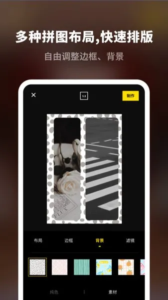 2、便捷操作与功能:提供一站式拼图修图功能,操作简单,适合新手。多种拼图布局可快速排版,能轻松调整边框圆角,自由更换纯色或花式背景。经典九宫格切图3秒裁剪、一键成图,还能快速发布到社交账号。