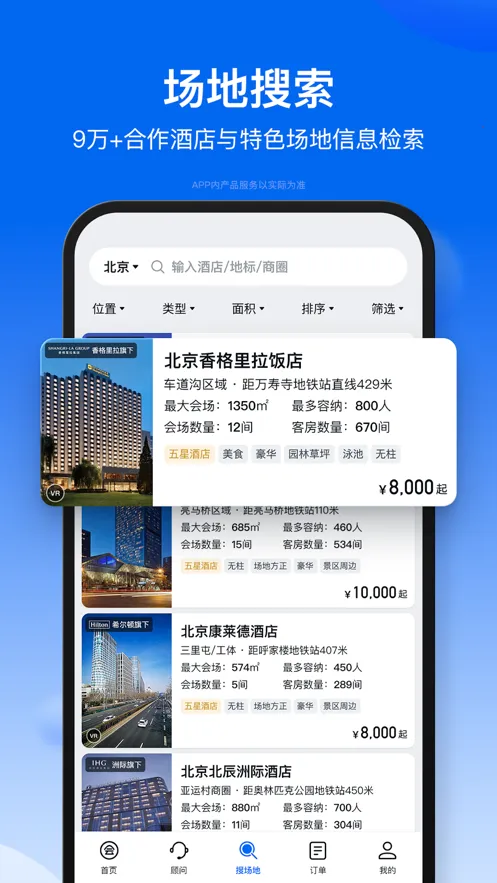 2、海量选择与专业顾问:平台直连全国2万家酒店及7万个特色场地,资源丰富且经过严选,更有专业顾问全程一对一服务,助您轻松匹配理想会场。