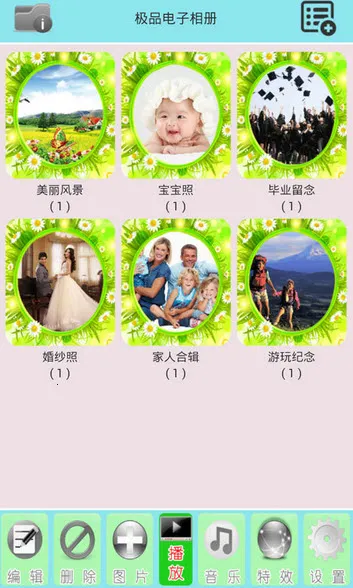 2、能为手机图片创造精美极致的动感影集,可新建任意多个自定义名称的电子相册,添加手机图片即可放映。