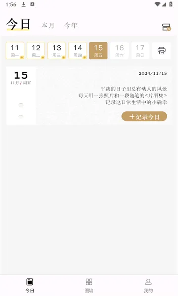 4、复盘超清晰:日历视图功能让用户清楚知晓不同年份和日期自己做过的事,便于回看和复盘,调整后续安排。该软件走简约风格,页面排版整齐有序,用浅色系如棕色、米色、白色等,看起来很舒服,能让人感受到温暖与治愈,快去记录生命中的美好瞬间吧。此软件无内置恶意弹窗广告,下载链接稳定,支持断点续传,功能完整无阉割,安装包大小适中,安装流程简单。对安卓系统版本有一定要求,老旧机型可找适配历史版本,新机型能体验最新功能。