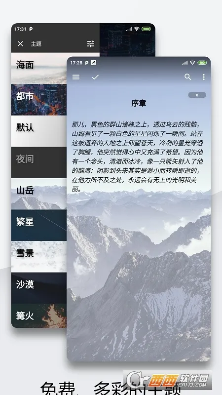 3、软件提供丰富个性化设置,可自由切换书籍或文件式管理模式,自定义书籍封面和背景皮肤,还有多彩主题背景带来舒适视觉体验。