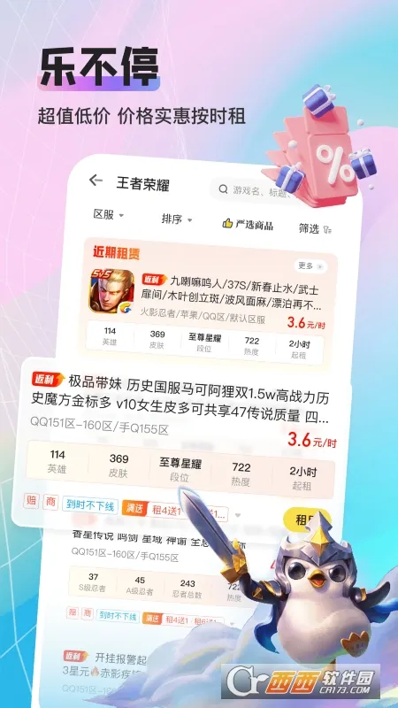 2、游戏覆盖全品类,当下热门的王者、lol、和平精英等火爆新游账号都能在此租到,轻松体验不同游戏。