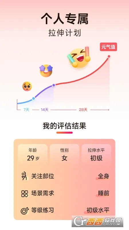 元气拉伸是一款拉伸训练软件,为各年龄段、不同群体提供多场景专属课程。由专业教练带练,融入人体工学防损伤,还具备AI测评、打卡激励等功能,助用户科学拉伸,提升健康水平 。
