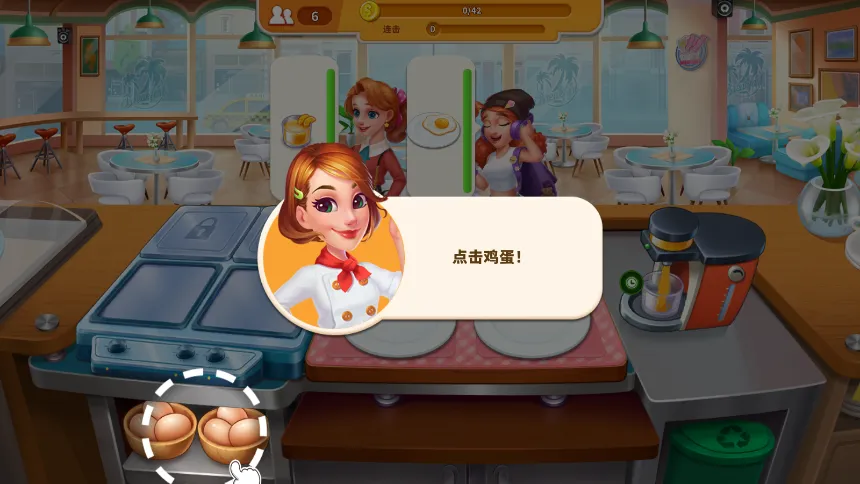 1. 它玩法简单易上手,玩家能轻松体验。比如打开游戏,面对顾客点的煎蛋,点击篮子里的鸡蛋,等绿色进度条满烹饪完成,点击食物放至出餐区再点就能上菜,豆浆饮品还能直接递送,操作轻松。
