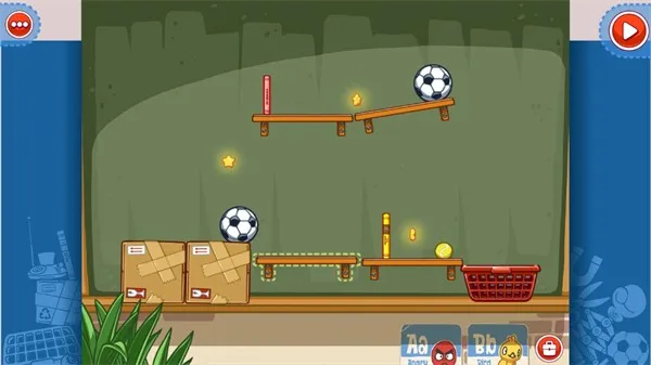 我们只需要将两个木板凳放在斜放在两侧,气球放在足球下面,这样使气球飞上去,碰到足球这样就能获得星星。