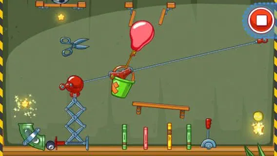 我们只需要将两个板凳放入图中所示位置,和一个气球放在那个书本底下,就可以让球滚下,获得星星。