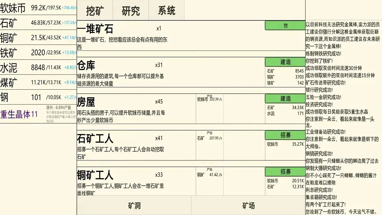 2、在重生挖矿2025最新版本中,可以投身科技研究,解锁各种科技,从基础工具到自动化技术,科技力量将为你的冒险保驾护航。