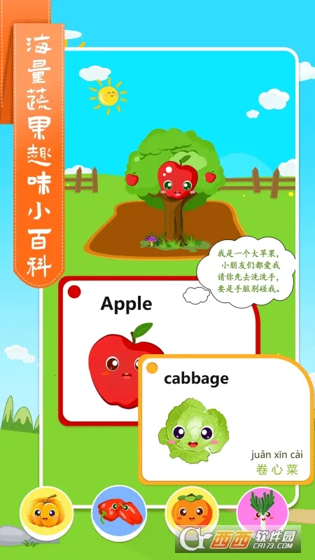 1. 涵盖常见蔬果,进行双语启蒙,拓展孩子语言学习范围,培养国际视野与跨文化认知能力。