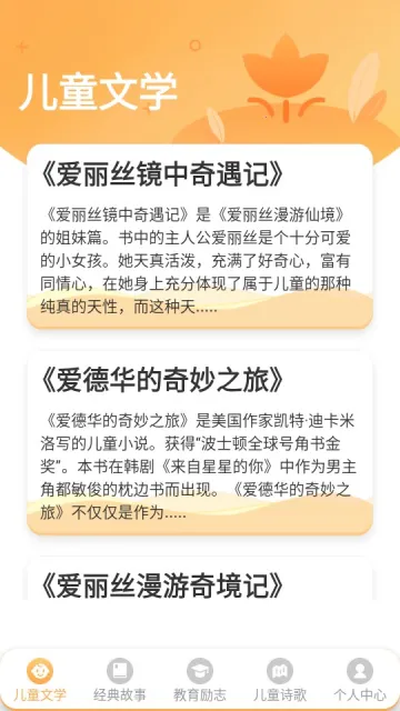 2、它有丰富的文学书籍种类,涵盖诗歌、故事、儿童文学、国学等,支持在线阅读、学习,还能查看历史学习记录、下载全本。