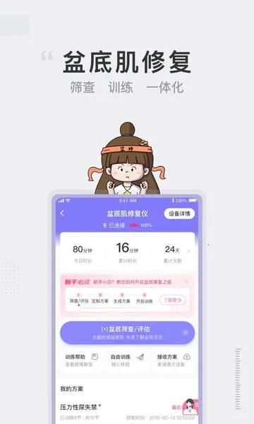 多种训练设备支持,包括凯格尔球和盆底生物刺激反馈仪等,满足不同需求。持有盆底生物刺激反馈仪的用户可免费自主健康评测,便于自我监控。