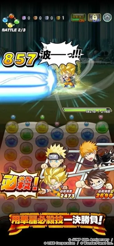 1. 游戏融合消除与角色扮演,操作简单,通过指尖点击就能触发角色强力招式,在消除中感受热血战斗,比如悟空能施展龟派气功,幽助可发出灵丸,各角色绝招华丽。