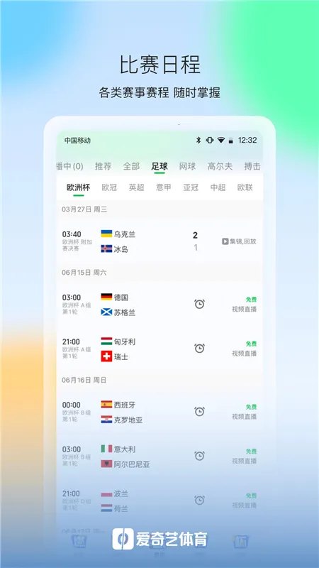 爱奇艺体育是为体育爱好者打造的手机应用,提供足球等多项目高清直播与赛事回放,有赛程战报资讯。英超球迷熟悉的新英体育App已更名至此,福利多、功能全、特色足,满足观赛需求。