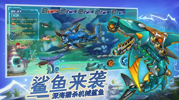 1. 它的画面表现出色,采用3D引擎精细建模,真实还原鲨鱼肌肉律动与金属关节咬合细节,配合动态光影与流体物理效果,带来沉浸感十足的水下体验。