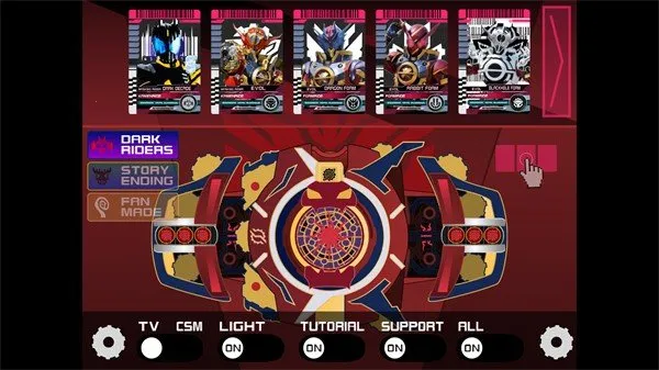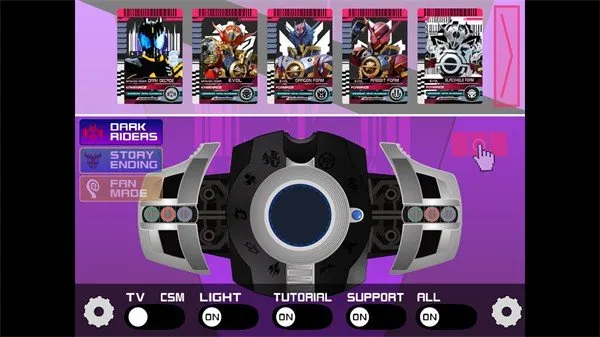 游戏将经典的神主牌切换模式与新世代触屏卡玩法相结合。玩家需按顺序插入实体卡片,并在屏幕上点选对应图标完成变身。这种设计既忠于原作设定,又增强了玩家的参与感与互动趣味。