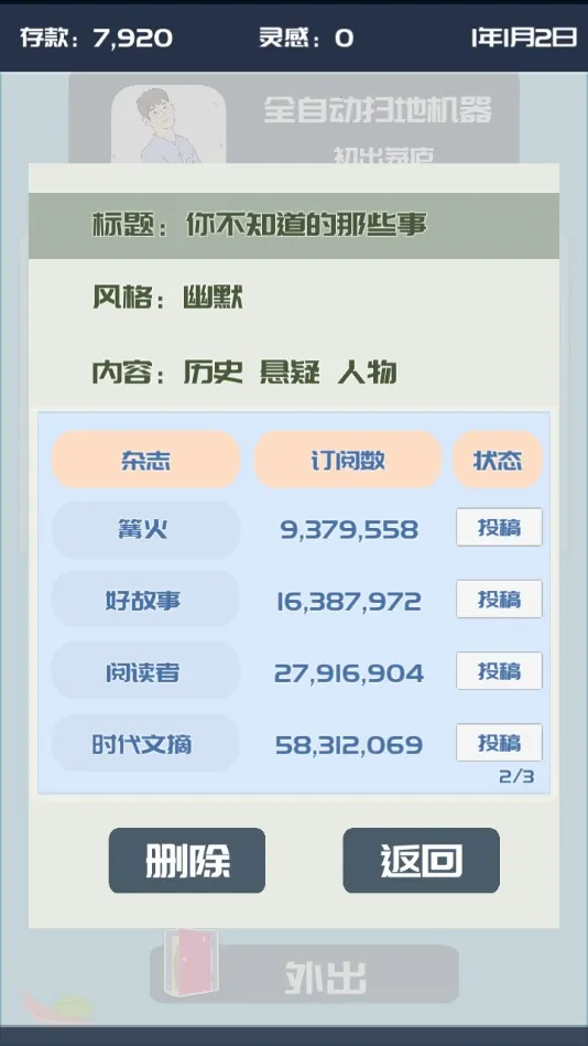 3. **清晰合理的发展节奏**:前期开局有启动资金,优先刷灵感,资金消耗到一定程度再创作,前期不建议直接发公众号,可投稿书刊积累粉丝和稿费。中后期可购买宠物、房子,更换神兽,持续提升写作能力,随着灵感发布,收益不断增加,粉丝数量也逐步增多。