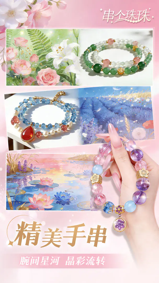 串个珠珠2026官方正版中,玩家化身手串摊主,依顾客订单用多种珠子定制手串,玩趣味小游戏解锁材料,升级摊位,还能社交互动、创意比拼,体验经营与制作乐趣,实现商业梦。