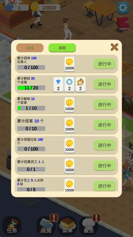 3、玩法独特,通过合成解锁菜品,消除升级雇员。