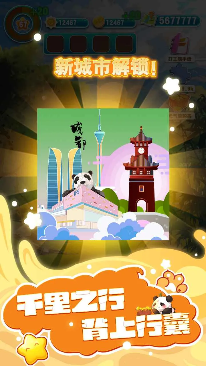 3、探索多样城市,大熊猫可凭借行装宝物获得更高体力值游历更多城市,每个城市都有独特景观和任务等待玩家去完成。
