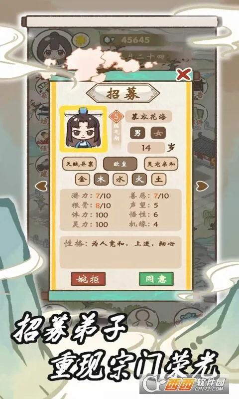 2、可自由招募弟子,依据其品质和职业定位组建队伍,还能详细查看弟子资质灵性等信息,避免招募到不合适的对象。