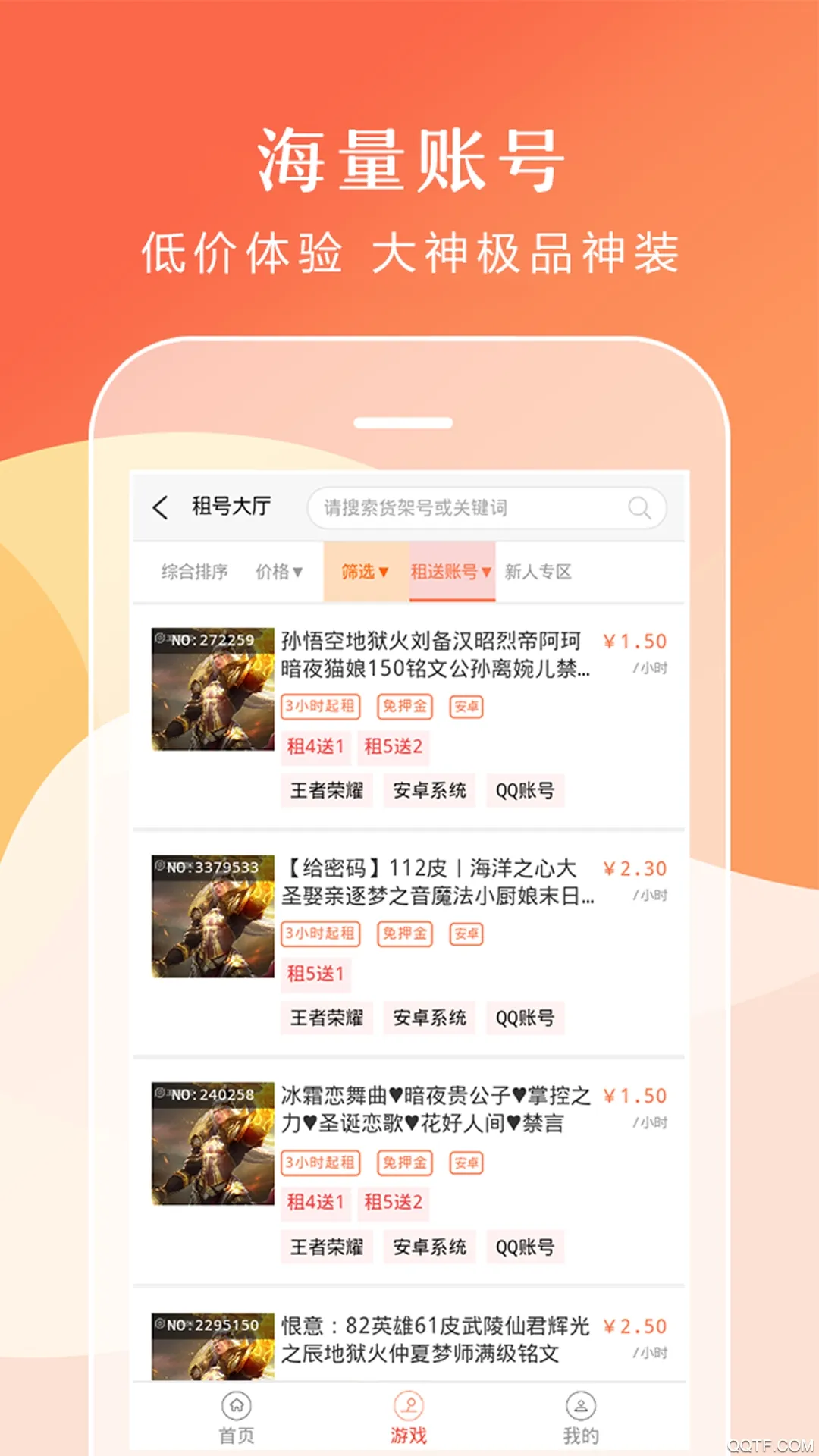 2、价格实惠体验佳:能让用户以低价体验高端账号,享受大神极品装备,用较少的花费获得土豪般游戏感受,还常推出免押金、租送时长等优惠活动。