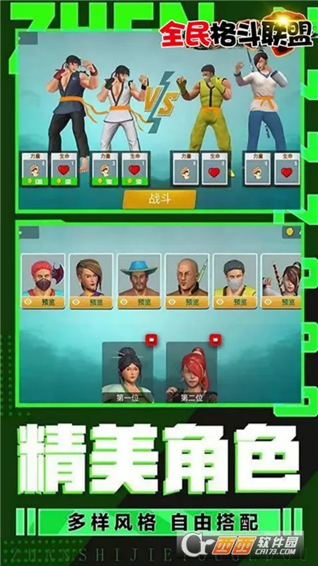 1、丰富角色与技能:包含众多风格各异的角色形象,每个角色都有对应的英雄格斗技能,可选择擅长的角色开启格斗对决。