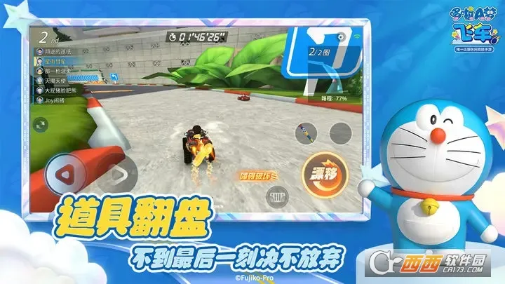 1、经典IP改编:由童年经典漫画哆啦A梦正版授权,哆啦A梦、大雄、胖虎等熟悉角色悉数登场,在游戏中展开激烈有趣的竞速大战,还良心还原原著细节。