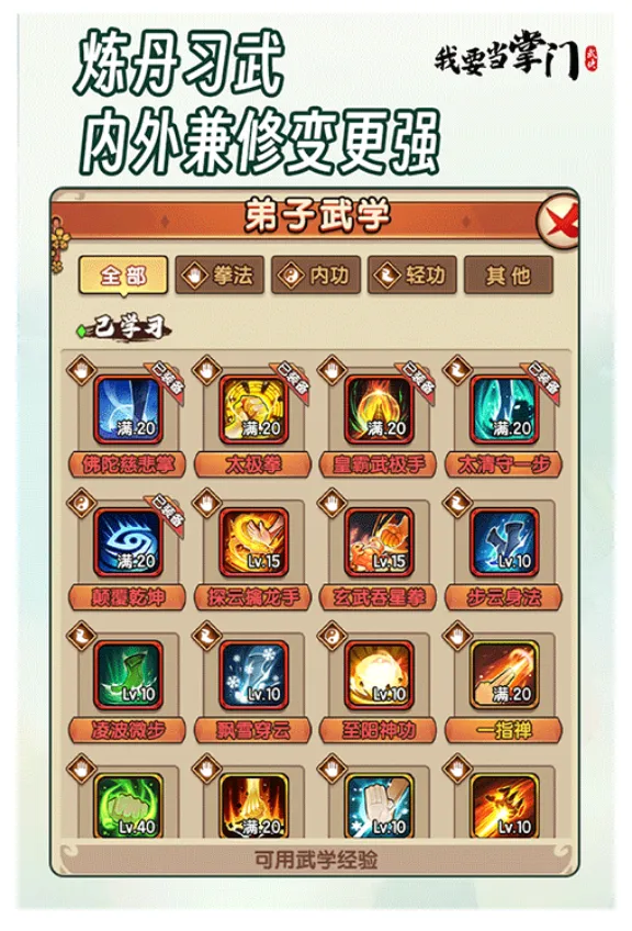 4、武学搭配,精进造诣。上百种武学功法,弟子可抄录修习,拳剑刀等样样齐全,多样搭配等待掌门发掘提升战斗属性。