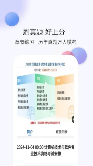软考真题库 2025 官方最新版本,专为软考备考打造。提供丰富题库与课程,支持直播、试听、刷题。有成绩查询、报考指导等功能,多种学习模式,界面极简,助用户一站式高效备考 。