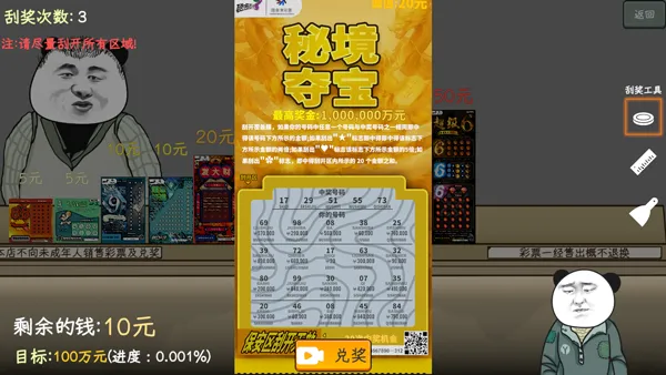 中国式彩票(模拟刮刮乐)是移植自Steam的休闲手游,将刮刮乐做成独立模式,新增多种刮刮乐,融入合作玩法。模拟真实购彩体验,有多种玩法和统计功能,还能让人感受氪金乐趣。