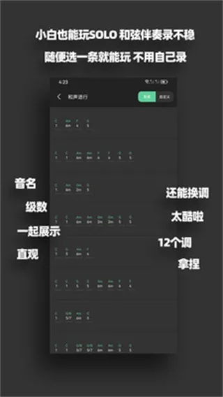 2、多样化的练习场景:包含节奏、音阶、扫弦等多种练习场景,满足不同学习阶段需求。