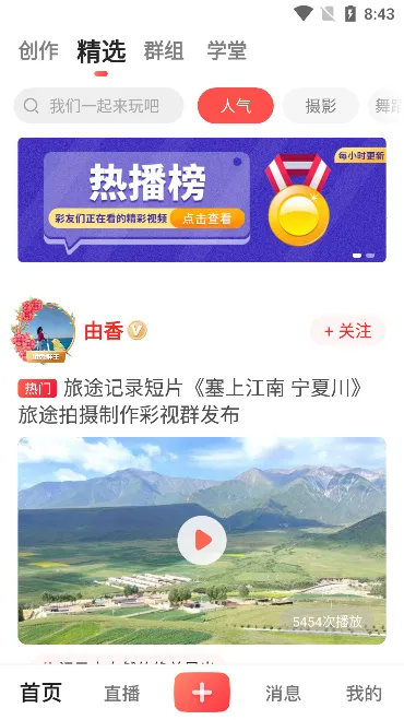 3、社交互动性强:拥有社区互动功能,是彩友们的聚集地,作品出色可登上热门佳作榜,还有海量视频资源,多频道展示满足视听需求,支持专辑分享到多个热门好友圈,也能加入同城兴趣群组交流。