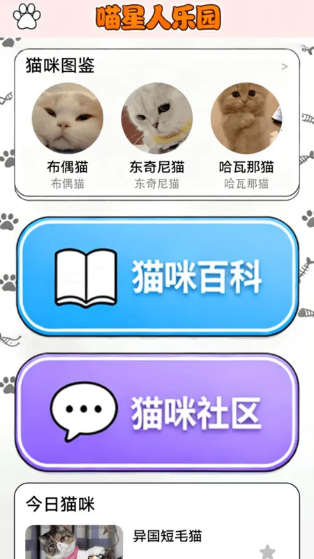 2、于喵星人乐园可了解猫咪图鉴、百科和社区等内容,在猫咪社区能感受不同视频的精彩,知晓互动乐趣。