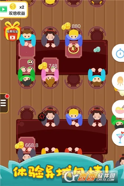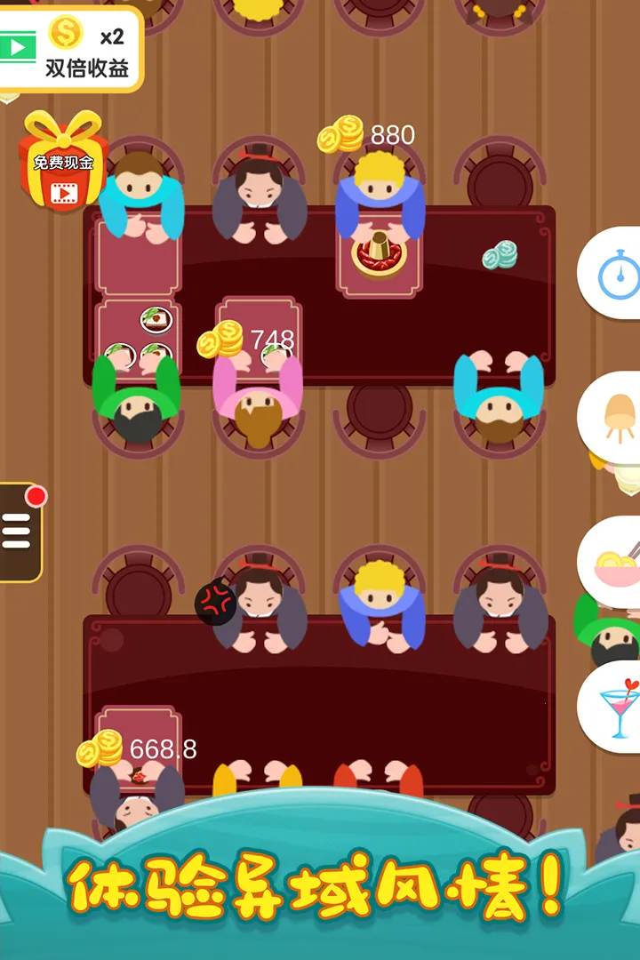 3、厨房自由定制:能自定义厨房氛围,添加仙女灯、盆栽植物、木架等装饰,升级工具,为厨师穿上可爱的围裙、拖鞋和主题服装,打造属于自己风格的厨房。
